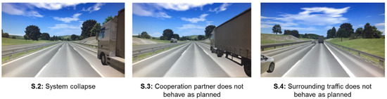 - S.3 Cooperation partner does not behave as planned: The truck driver overtakes a truck with a 2 km/h differential speed. Shortly after the overtaker has pulled out, the cooperation partner does not keep to the agreed speed reduction (−2 km/h) and accelerates again to the initial speed.