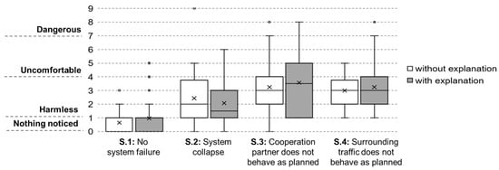 After each drive with and without system failure, the subjects were asked to rate the criticality of the driving situation they had just experienced. Figure 5 illustrates the results for all four simulated situations (S.1 = no incident, S.2 = system collapse, S.3 = cooperation partner, and S.4 = surrounding traffic). No significant difference was found in the criticality rating between the respective situations with and without explanation (Table 4). The “cooperation partner does not behave as planned” abort scenario (S.3) was rated most critically by the truck drivers.