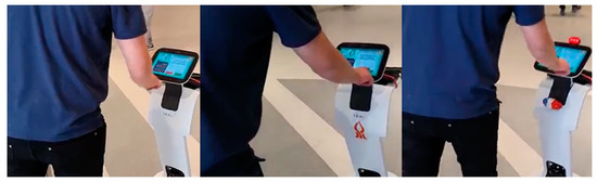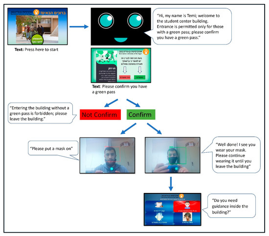 A personal robot (we used Temi, purchased via ONE robotix [34] its local distributer in Israel) was designed as a COVID-19 Officer Robot (COR) to guide participants entering a public space and ensure they comply with COVID-19 restrictions—possessing a green pass and wearing a face mask. A use-case scenario was created by programming the COR to include new functionalities: informing passersby of the building’s entrance restrictions and asking for their green pass, detecting if the person is wearing a mask, and leading the person to a particular location in the building [35]. The scenario sequence of interaction with the COR (Figure 1) was as follows: