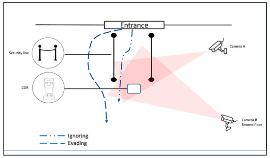 For all sessions, we created an entrance queue using two rope barriers, leading all passersby to the COR at the front of the line. Two video cameras filmed the interaction; camera A was placed near the COR to film passersby’s reactions and expressions. Camera B was placed on the second floor, providing a broader picture of the whole situation. Figure 2 presents the two cameras’ views, and Figure 3 illustrates the site map.