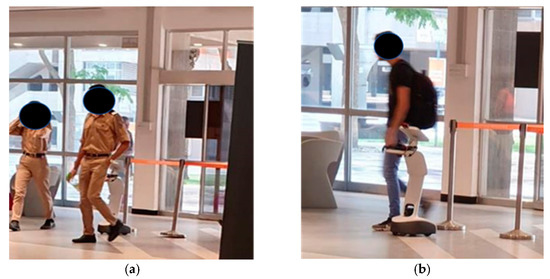 Two students entered the building and followed COR’s instructions. At the end of the session, they asked the robot to escort and guide them somewhere in the building. While COR was calculating the path, the two students passed it and tried to call it using voice and hand gestures to follow them (Figure 7).