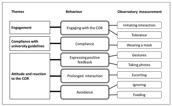 The following three themes emerged from the thematic analysis: engagement, compliance with university guidelines, and attitude and reaction to the COR. These themes are conceptual notions that helped us define unique behaviors related to human–COR interaction. The following behaviors were defined through specific measurements identified in the observations, as detailed in Figure 9: