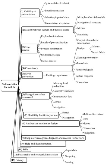 There are various techniques and methods which can be employed in the usability assessment of software, including mobile guide, AR, or VR. Gómez et al. [23] proposed a compilation of HE checklists taken from the existing bibliography but readapted to new mobile interfaces. Selecting and rearranging these heuristic guidelines provides a useful tool for both evaluation and a best-practices checklist. This experiment shows that the proposed checklist is very useful to avoid usability gaps even with non-trained developers. The resulting framework includes 13 sub-heuristics for mobile (adapted from 10 Nielsen usability heuristics and three new ones). The three new sub-heuristics are skills, pleasurable and respectful interaction, and privacy (See Figure 1). Inostroza et al. [41] proposed the 12-item usability heuristic set, which was also based on Nielsen’s heuristics and modified a new attribute, physical interaction and ergonomics. According to these researchers, traditional methods for usability measuring do not fit the nature of interactive devices. Both above studies used the same approach: usability heuristics developed using a mixing process involving the existing heuristics (Nielsen’s heuristics) in the mobile context.