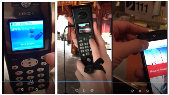 For audio guides, in each museum, videos about its operation (all in English) were filmed and sent to the evaluators. The length of each video is 3 min maximum and were recorded by the camera with at least 7.2 megapixel (the general rule for high-quality sharp prints is 300 pixels per inch) to guarantee the effective visualizations. We had three videos with 3:00, 2:05, and 2:15 min length for VNMH, TL, and NMA, respectively. To evaluate the usability of audio guides and websites, in this research, we consented that the quality of a video would not be paid much attention; instead, we focused on the performance of these applications (Figure 2). Expert-based evaluations were conducted via video of visitors’ interactions that contributed to data collection. Therefore, the experts did not need to attend the museum directly. However, evaluations via videos have their drawbacks, as discussed in the last part of Section 5.