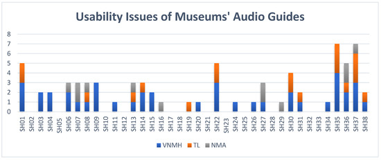 Figure 4 shows the total number of audio guides’ issues of the three national museums regardless of the severity rating scales. VNMH’s audio guides are recorded having more problems at SH01-System status feedback, SH09-Simplicity, SH22-Fat finger syndrome + Accidental activation, SH35-Physical interface/buttons, and SH37-Help menu. The total numbers of audio guides’ issues of VNMH, TL, and NMA are 41, 19 and, 12, respectively. Of the data gathered, Vietnamese audio guides noted more usability problems than Australia with the ratios of 3.4:1 (VNMH and NMA), and 1.6:1 (TL and NMA). The Vietnamese audio guides’ usability problems were mainly recorded as the outdated model, only text appears on the screen, lacking the related image(s) to the background and illustration or videos (VNMH), and bulky and old-styled device (TL).