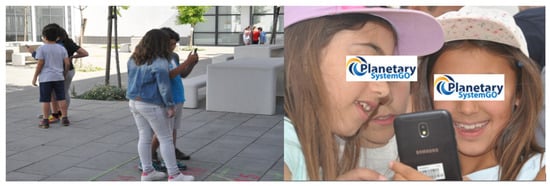 Figure 2 shows students playing the game in their schools, before the COVID-19 pandemic, where joy on their faces is visible. Having fun is fundamental to the effectiveness of the game in the students’ performance, because if they find the game boring, they will give up playing it, and consequently will not learn from the application. This is in line with [9], where it is stated that it is important to design enjoyable games to be used in educational contexts. Furthermore, because the MAR application has learning purposes and provides physical movement and social interaction of the students in the real world, it is a serious pervasive game [15,41].
