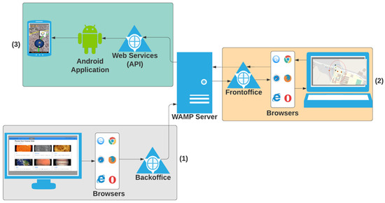 The PlanetarySystemGO information system is mainly composed of two components, an Android application, and a web application, that share data on a common server. The MAR game is played on the Android application developed in Unity. The web application runs on a WAMP server (Windows, Apache, MySQL and PHP) and includes web-accessible back-office and front-office systems (Figure 3).
