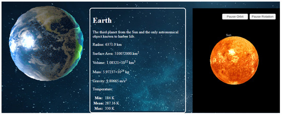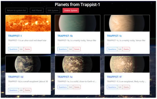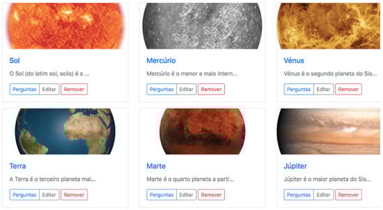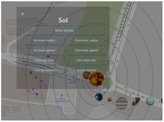 Furthermore, the information system includes a web application with a back-office that allows adapting the contents to the school curricula and to the grade level of the students who play the MAR game, namely the information about the celestial bodies and the questions about them. An important upgrade of the information system is the possibility of using the web application to model planetary systems in a georeferenced map, which can be done in the classroom or online classes. This last feature is important in situations of social isolation such as the ones caused by the COVID-19 pandemic, as will be exemplified in Section 5 and Section 6.