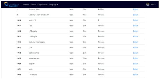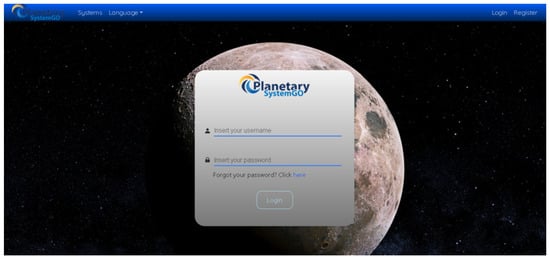 - Rocha, G.; Alegria, B. Planetary System Backoffice; Technical Report; Instituto Politécnico de Tomar, Quinta do Contador, Estrada da Serra: Tomar, Portugal, 2020. [Google Scholar]