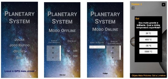 It is in this context that the PlanetarySystemGO has been designed, since 2015, by higher education students. Every school year teams of three or four Computer Engineering BSc final project students keep upgrading the project based on the result of the design research cycles. The first version was called SolarSystemGO and consisted of a MAR game hard-coded on the application that only permitted exploring our Solar System. Although this was a preliminary version, it was tested in informal learning environments and the authors concluded that children were engaged during the game and that this approach promoted learning of interdisciplinary subjects related to the Sun and the planets of the Solar System [46]. Because of this positive student feedback, the game designers decided to keep upgrading the application to include more functionalities in order to be implemented either in informal or formal learning environments. The last version is an information system that includes a location-based MAR game designed to promote learning about the Universe. When playing the game, in addition to exploring planetary systems, the players have access to information about the learning objects such as celestial bodies and, also, need to answer multiple-choice questions related to them. Moreover, at each stage of the game such as finding orbits, planets and answering correctly to the questions, the players collect points, thus providing a gamification experience (Figure 1).