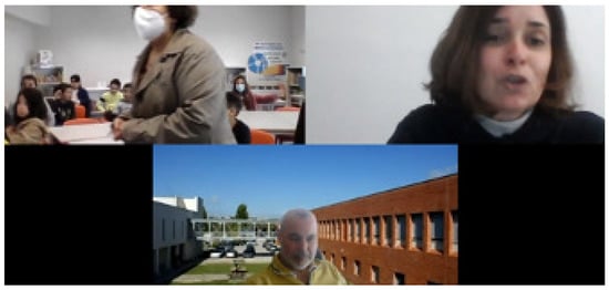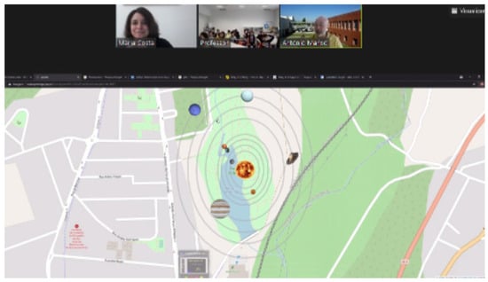 In addition, a new important contribution is the web application that can be used to model different planetary systems in georeferenced maps. This can be done in the classroom or online, for example using the Zoom platform, which is very useful in social isolation situations caused by the COVID-19 pandemic (Figure 15). With this tool, it is possible to place the Sun in the school position on a map, and to discuss with the students where the planets will circulate in their village or town, according to a chosen scale, amongst other possibilities. This new tool was implemented in the online workshops and students showed great enthusiasm and were excited when they recognized their school and city garden (Figure 15). Therefore, this tool promotes STEM education [17,26], which contributes for schools to better prepare students to respond to real-world challenges, and consequently to innovation, scientific knowledge and economic growth in the countries [27,28].
