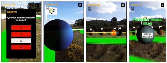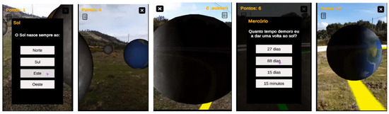 This paper presents an interactive information system designed to promote STEM education in schools. The PlanetarySystemGO includes a web application and a location-based MAR application with game-based learning purposes related to the planetary systems of the Universe. Because it requires GPS, the game is played in an outdoor environment, which is the real world, captured by the mobile device camera, and the virtual objects are celestial bodies that appear on the screen of the mobile device [18]. During the game, the players need to move in the real world to capture virtual objects, which are stars, planets, and other celestial bodies. Because it provides physical movement and interaction with the real world, this game is also included in the pervasive games’ paradigm [5,15]. In fact, joining the surrounding environment (physical world) with the fictive game’s world improves the player’s engagement and promotes situated learning approaches [41]. When the player captures a celestial body, a question about its characteristics appears on the screen of the mobile device with four possible answers (Figure 20 and Figure 21). When finding the virtual objects and correctly answering questions, the players gain points, which is related to gamification advocated in the literature because it increases the players’ motivation and immersion in the game [9].