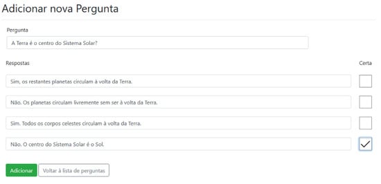 - Questions, to deal with their interaction, namely the creation, edition and deletion;