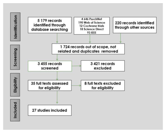 First, titles, keywords, and abstracts of found articles were examined to exclude papers which did not include autistic children (or the diagnosis was not specified), and papers not including a technological system or not reporting full details of studies. In the first exclusion process, including the initial search terms, the first author read the abstracts of the 5179 papers to select studies for potential inclusion in the review. The initial selection included 4646 papers from PsychNet, 190 from Web of Science, 12 from Cochrane trials, 18 from Science Direct and 93 from IEEE. Also, 220 papers resulted from a wider web search. Papers were excluded either because they were out of scope, i.e. they included systems or technology for activities unrelated to Music-therapy and related interventions (n = 1724) or were posters or workshop papers (n = 3421) (Figure 1).