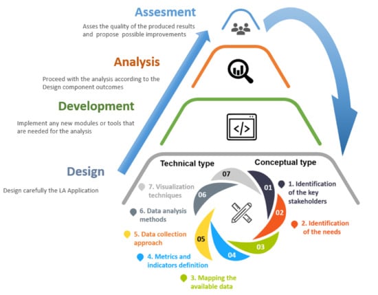 We believe that special emphasis should be placed on the correct design of the LA process. Therefore, based on related research on LA and instructional design methods, the proposed framework provides detailed instructions by dividing the design component into seven distinct stages (Table 1) of two types (i.e., technical and conceptual) that researchers should follow in order to design an effective LA application for education.