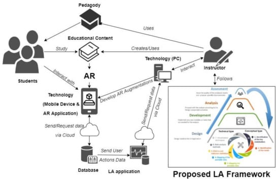Students, on their side, have access to the educational content and can use their mobile devices (mobile phones, tablets, AR glasses, headsets) to access the augmentations and interact with the educational content. Every action of the students is stored in an external database. These data can be used as an input for the LA process. The instructor follows the proposed framework phases and designs the LA application, uses technology for the development component (if this is necessary) and proceeds with the analysis of the recorded data according to the design component outcomes. Finally, the instructor assesses the quality of the produced results and proposes improvements in both the LA process and applied pedagogy, educational content and/or AR application.
