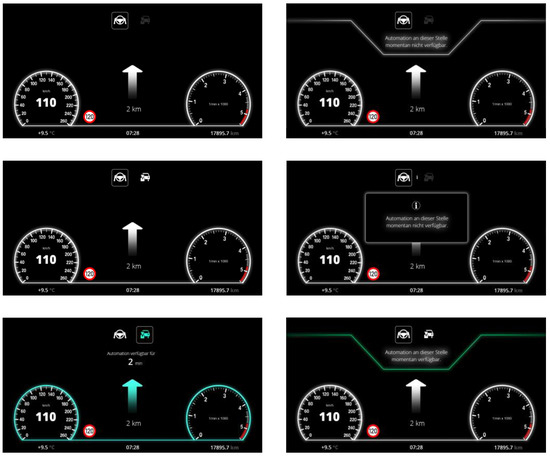Human–machine interface (HMI) concepts: (Top left): Manual driving; (middle left): Automation available; (bottom left): Automation activated; (top right): Context-adaptive non-availability notification; (middle right): Pop-up with non-availability notification; (bottom right): Context-adaptive availability notification.