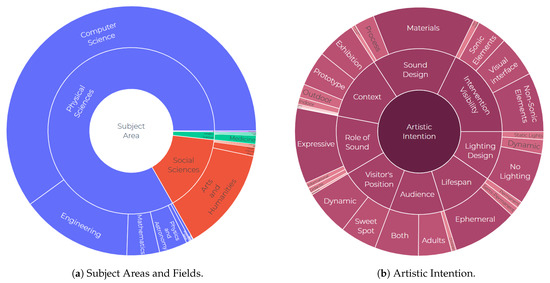 Sunburst chart snapshots showing (a) subject areas and (b) artistic intention across the corpus.