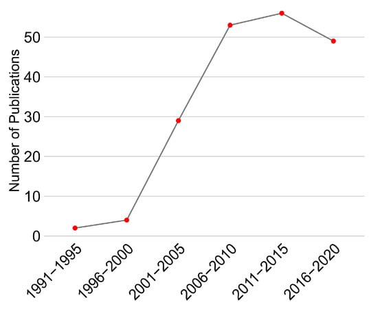 The 181 documents in the review were published in 78 different publications. They predominantly consist of proceedings papers (137 articles in 58 proceedings series), but also in journal articles (42 articles in 18 journals) and two book chapters (from two books). According to the present corpus, when considering 5-year increments, academic, peer-reviewed documentation of interactive sound installations likely gained in popularity in the early 2000s until stabilizing at around 50 publications in 2006 (cf. Figure 4).