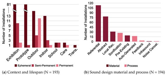 Overall, the interactive sound installations reviewed are mainly designed for exhibitions and/or as prototypes (c.f. Figure 6a). The sparsity of sound installations designed for indoor and outdoor public spaces could be partially explained by logistic constraints inherent to their design and deployment—for instance, adding sound to existing public spaces requires installations to be non-disruptive and coherent with their surrounding environments [14,35]. Outdoor sound installations are also likely to be encountered by the most diverse audience, implying the need for inclusive content [36]. Additionally, installations in outdoor public spaces are often designed for long-term deployment (c.f. Figure 6a), which brings in additional constraints in terms of durability and resistance to meteorological conditions (rain, heat, humidity, etc.). Designing installations for exhibitions or as prototypes is less restrictive regarding any of those aspects.