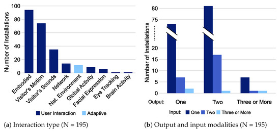 There is a wide variety of interaction types, yet only three were shared by more than 15 installations (c.f. Figure 7a): embodied interaction is the most common (N = 94), followed by visitors’ motion (N = 74) and visitors’ sounds (N = 35). Among all installations, eleven are purely adaptive—i.e., they do not interact with users but rather react to external parameters such as meteorological information.