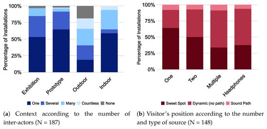 Multiple relations can be found across perspectives. The results presented highlight notable relationships. Figure 9a shows the relationship between context and the number of inter-actors. Installations from the corpus most often require a single actor (N = 98) in the contexts of exhibition, prototypes and indoor public spaces. However, the majority of outdoor sound installations require more than one actor, and most of the installations that are purely adaptive (c.f. Figure 7a) are located outdoors. Otherwise, as shown in Figure 9b, static positioning of the visitors is most often required for installations with one or two sound sources, while the installations with multiple sources or that use headphones more often require the visitor(s) to move freely within the installation.