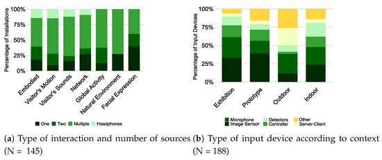 Finally, the relationship between context and type of input device is worth highlighting (c.f. Figure 10b): installations designed for exhibitions, as prototypes or for indoor public spaces, share similar trends concerning the type of input device used for interaction, namely, image sensors, microphones and controllers. On the other hand, installations designed for outdoor public spaces seem to favor other types of input devices apart from microphones, such as server-clients and various miscellaneous input devices, such as environmental sensors.