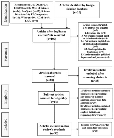 At the beginning of the search strategy, this study’s authors conducted a systematic search to identify previous works from the relevant literature using several electronic databases. The focus of this search was mainly educational technology, computer science, and social science databases with the purpose to perform an exhaustive search. The most relevant were ACM, JSTOR, SCOPUS, ScienceDirect, EBSCO, ERIC, Wiley, Web of Science, and IEEEXplore. All searches were made separately using each database between December 2006 to December 2020, as the educational uses of 3DVWs have gained popularity and attracted researchers’ interest since 2006 [].