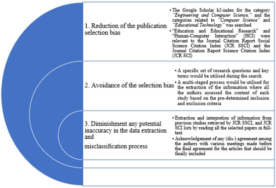 Three criteria under consideration were taken to eliminate the impact of bias in this review’s search strategy [], as Figure 2 depicts.