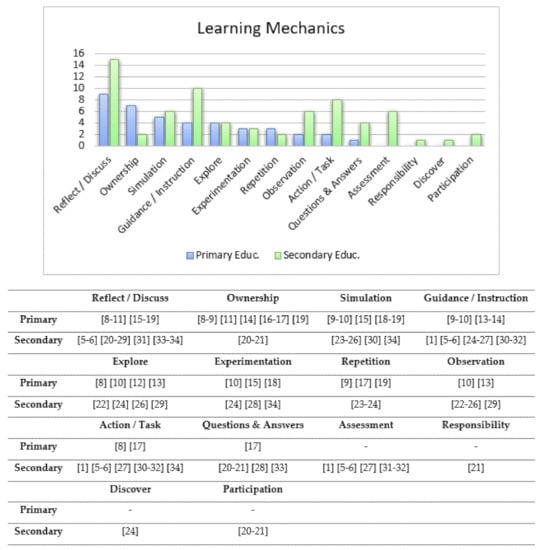 According to the above-mentioned analysis and the comparison provided in Figure 3, a significant body of literature [,,,,,,,,] related to primary education, utilized reflection and discussion, perhaps because students at this age (under 12-years-old) want to immediately engage and discuss their own experiences, thus facilitating their creative reflection by interacting with 3D visual objects. While, in secondary education, a number of studies (e.g., [,,,,,,,,,]) utilized the same learning mechanics to a large extent for collaborative tasks, while some others (e.g., [,]) have also integrated assessment tools to measure students’ outcomes and achievements in-game (i.e., correcting and applying coding tasks or integration of puzzle-based tasks).