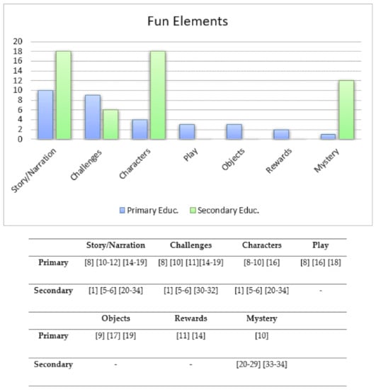 All game prototypes in primary education settings featured one common motivational element; they operated around specific objectives that dictated the player’s action. Several of them offered a degree of the player’s freedom through choices (n = 6), decisions in structured dialogs or simple patterns of exploration (e.g., [,]). Games with more complex gameplay had specific rules (n = 3) that governed the flow of the game and the progression between levels [,]. Similarly, all included prototypes applied predominantly the interactive elements of roleplaying, utilizing various resources and objects of 3DVWs (e.g., [,]). More advanced implementations also deployed conflicts that the player had to solve (e.g., [,]). The recorded fun elements of game prototypes are presented in Figure 5. The common denominator was the combination of a story with a series of academically meaningful challenges that players had to face (e.g., [,]). More advanced implementations involved non-player characters [,], as well as the freedom of playful roaming, exploration, and action in the open environment of 3DVWs [,].