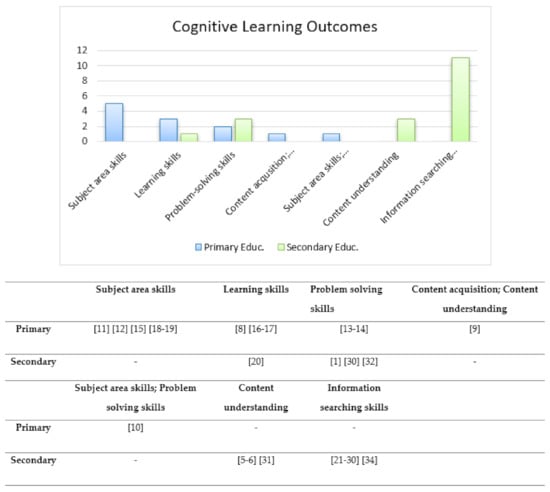 Cognitive learning outcomes presented via primary and secondary education studies.