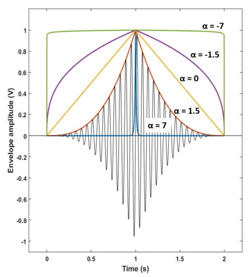 The second block of stimuli contained more complex and qualitatively varied waveforms with the aim of covering all areas of the circumplex space. A rich set of stimuli were created by multiplying a high-frequency sine wave with a parametrised envelope waveform as shown in Figure 1. The envelope types were simplified so as to have an increasing first half and a decreasing second half described by , where c is a constant defining the start time and is the control parameter taking the values −7, −1.5, 0, 1.5 and 7. The control envelopes were applied concurrently to all attributes of the stimuli. They were 2 s in duration (1 s increasing, 1 s decreasing). This duration was increased from 1.5 s (as in block 1) to 2 s to avoid clipping of the stimulus. Changing varies the onset and offset shape of the pulse, affecting the qualitative “sharpness” of the sensation as well as the energy of the stimuli. The effect of stimulus energy on affective response was evaluated using the stimuli in both blocks of the experiment.