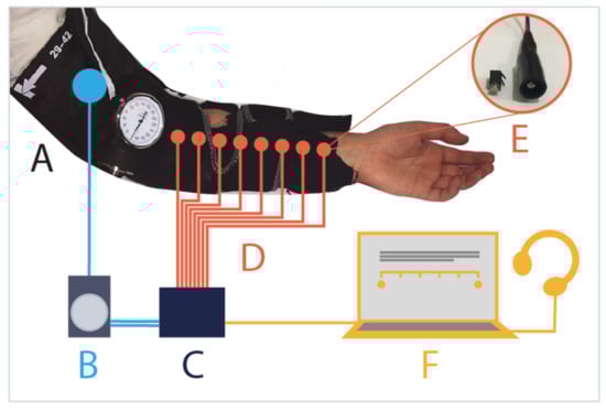 Pump-and-Vibe, as shown in Figure 2, is formed of a cotton sleeve with adjustable velcro straps and an array of inner sewn pockets into which vibration motors can be fitted. Eight vibration motors (ERM (cylindrical) motors, 3 V, 65 mA, 3000 RPM) encased in cylindrical, 1 cm diameter, hard plastic casings fit into an array of sleeve pockets and are thereby held against the skin. The plastic cases help to distribute the vibrations across the skin, and the cotton material reportedly felt more comfortable on the skin and softened the vibrations in comparison to attaching the plastic cases directly to the skin. The pockets allow the motors to be placed in a multitude of arrangements within the sleeve, such as spiralling around the forearm, in successive pairs or in one ordered line down the forearm. For the experiment the vibration motors were placed in one line down the length of the inner forearm, as this was the best position for consistency between participants while allowing for good spatial variation. Badde et al. [] found that tactile spatial coding is complex and influenced by many factors. We aimed to minimise movement or visual feedback that might influence participant responses to the interface. Around the upper arm an inflatable cuff connected to an air pump (Airpo D2028B 12 V) forms a squeezing element that can apply pressure rhythmically to the upper arm. This allowed for an extra dimension of tactile sensation, capable of low frequency sensations that the vibration motors cannot create. The range of pressure used for the squeezing element was 30–50 mmHg, and for safety and comfort, it was ensured that the pressure was never high for periods longer than a couple of seconds. The physical squeezing sensation captures the wearer’s attention and is more comparable to natural touch than the vibration motors.