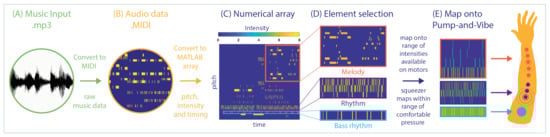 There are many possible methods of mapping music into tactile sensations. As the tactile space becomes better understood, increasingly sophisticated mappings can be devised and tailored to the individual. Most of the existing devices designed to map music into haptic sensation use some modified or reduced version of the raw audio signal as the vibration input. For Pump-and-Vibe we chose instead to map quantifiable and recognisable features of the music such as rhythm and melody to convey the key qualitative information of the music. Since these features of music are linked to our emotive response [], we hypothesised that the same would be true in our response to haptic sensation as touched on in previous studies [,]. Perceptually, these higher-order features may integrate more easily into music-related affective processing by being an “entry point” to existing sensory processes, as Schumann and O’Regan discuss in the context of sensory substitution [] and Rizza et al. discuss in the context of tactile speech aids []. Other key benefits of this method include its potential to be automated and the avoidance of a two-stage mapping of music first into the affective space—which is not yet well understood—and then from the affective space to the tactile space.