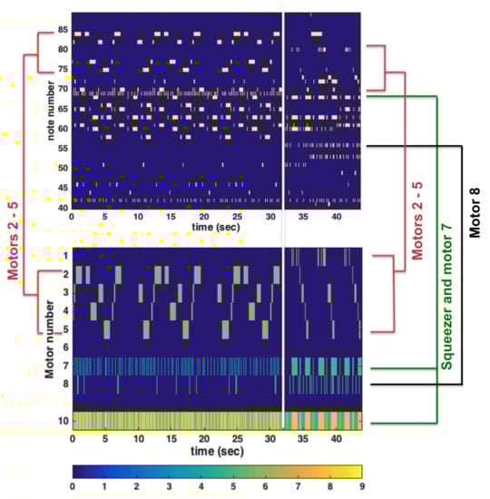 A protocol was designed for generating FeelMusic mappings of music samples. The protocol specific to Pump-and-Vibe, as illustrated in Figure 3, was used to generate mappings between original mp3 samples of music taken from a stock website (mp3 files provided in the data repository []) and an array of intensities to control the Pump-and-Vibe motors and squeezer. This mapping was generated and tested on music samples with clear rhythmic and melodic features. The first step in extracting information from music samples was to convert the original mp3 file to MIDI using an online converter (MIDI files provided in the data repository []). A package [] was then used to read the MIDI file into Matlab allowing the extraction of note intensity and timings from each sample. The squeezer element of Pump-and-Vibe was designed to convey low pitch and low frequency elements of a piece while the spatially varied motors are capable of conveying faster rhythms and melodies. Using this principle, the fundamental bass rhythm was identified in each MIDI file and mapped onto the range of pressures available on the upper arm squeezer. Figure 4 demonstrated this for an instrumental sample of the song “Ashes to Ashes”. Quicker rhythms and percussion that were not suitable for the squeezer were mapped onto the 3 motors closest to the squeezer on low power to add detail to the rhythm section without overpowering the melody (motors 7 and 8 in Figure 4). The key melody was then identified and mapped onto the remaining 5 motors by assigning a note to each motor in order of pitch so that pitch related to position on the forearm. The pitch of these notes was not accurately represented due to the low resolution of motors, but the rhythm and change in pitch could be represented. The power supplied to the vibration motors correlated with the volume of the music. All of these combined with the squeezer values formed an array of intensities for each 10 ms time step that could be saved to a text file and implemented by the Arduino. Our decision to use a 10 ms resolution could introduce a frequency artefact into the stimuli that could cause clipping of notes within the music. However, these effects were not perceptible and 10 ms lies within the temporal window for multisensory integration and perceived synchronicity of stimuli [,].