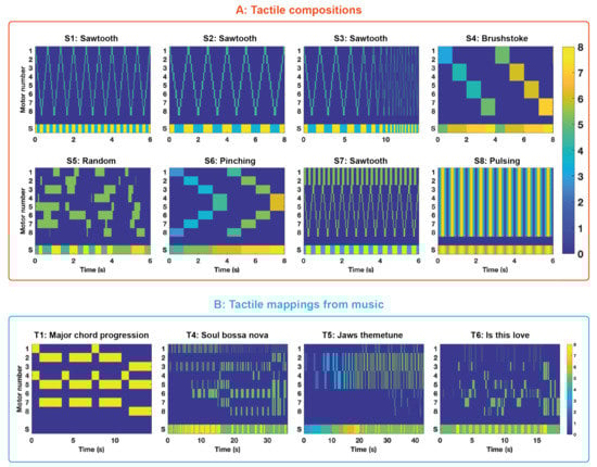 In total, 28 stimuli were presented to participants, split into four groups. The first group was a set of 7 music samples (M1–M7), as listed in Table 1. These were presented as auditory-only stimuli. The music samples were instrumental to avoiding any additional interpretation of lyrics and chosen to have clear rhythms and melodies that could be mapped onto tactile sensations. They were selected manually from a range of genres with the aim of eliciting a variety of affective responses as found by Imbir et al. []. Two of the music samples were not selected by genre, but were simple chord progressions in major and minor keys. The second group was a set of 7 tactile mappings (T1–T7) generated from these music samples using the FeelMusic mapping protocol, except for T7, which was a randomly generated tactile sample as a comparison. These were presented to the participants as tactile-only stimuli. Tactile mappings T1, T4, T5 and T6 are shown in Figure 5B. The third group (S1–S8) is a separate set of 8 tactile samples composed by hand for Pump-and-Vibe, as shown in Figure 5A. The fourth group (C1–C7) is the combined presentation of the music samples (M1–M7) with their respective tactile mappings (T1–T7).