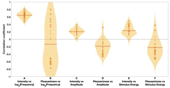 Correlation coefficients of intensity and pleasantness against stimulus energy for sine wave, square wave and envelope stimuli are shown in Figure 6E,F. Of the 20 participants, 19 had a positive correlation between intensity and stimulus energy (mean 0.206, std 0.137), of which 9 reached statistical significance. 17 of 20 participants had a negative correlation between pleasantness and stimulus energy (mean −0.209, std 0.247), of which 14 reached statistical significance.