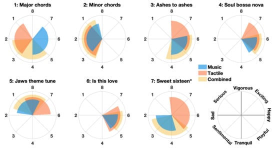 For M1 (major chords) and M7 (Sweet Sixteen) there is a clear mismatch between responses to these music samples and the tactile mappings T1 and T7. For M7 this is a positive result, since T7 was a randomly generated pattern of haptic sensations and not mapped from the music. The clear difference between M7 and T7 and the increased standard deviation of T7 responses lend validation to T2–T6 being successful mappings. For M1, the difference in responses flags an important aspect of the tactile mappings that needs to be taken into account. This aspect is the key or tone of a piece of music. The major chord progression (M1) and minor chord progression (M2) have very similar rhythmic and melodic aspects when projected into the tactile domain, as this is verified by the similarity of T1 and T2 responses. However, the change of key from major to minor completely changes the emotive response of the listener from positive to negative as demonstrated by M1 and M2 responses. This difference in affective response to key change is likely to be influenced by learned experience [] and culture [], effects that are not present for the new medium of tactile sensation generated by Pump-and-Vibe.