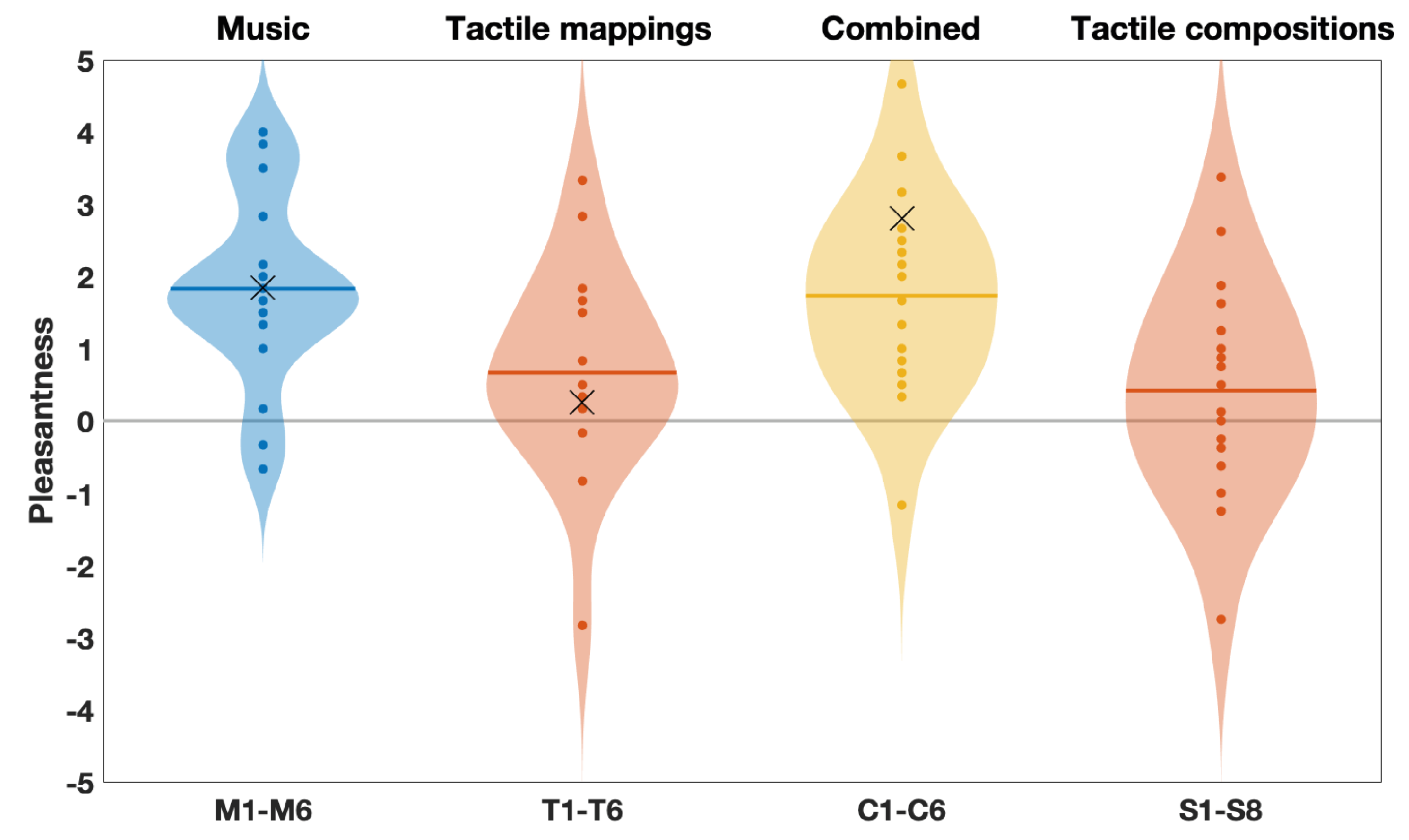 It was found that the pleasantness responses to the tactile mappings (T1–T6) and tactile compositions (S1–S8) were statistically similar and both greater than 0. While these responses suggest that the tactile stimulations as such are pleasant, independent of musical pleasantness, Figure 7 suggests that the mappings are more complex, since the spread of the data has increased, with more negative (less pleasant) responses than the music.