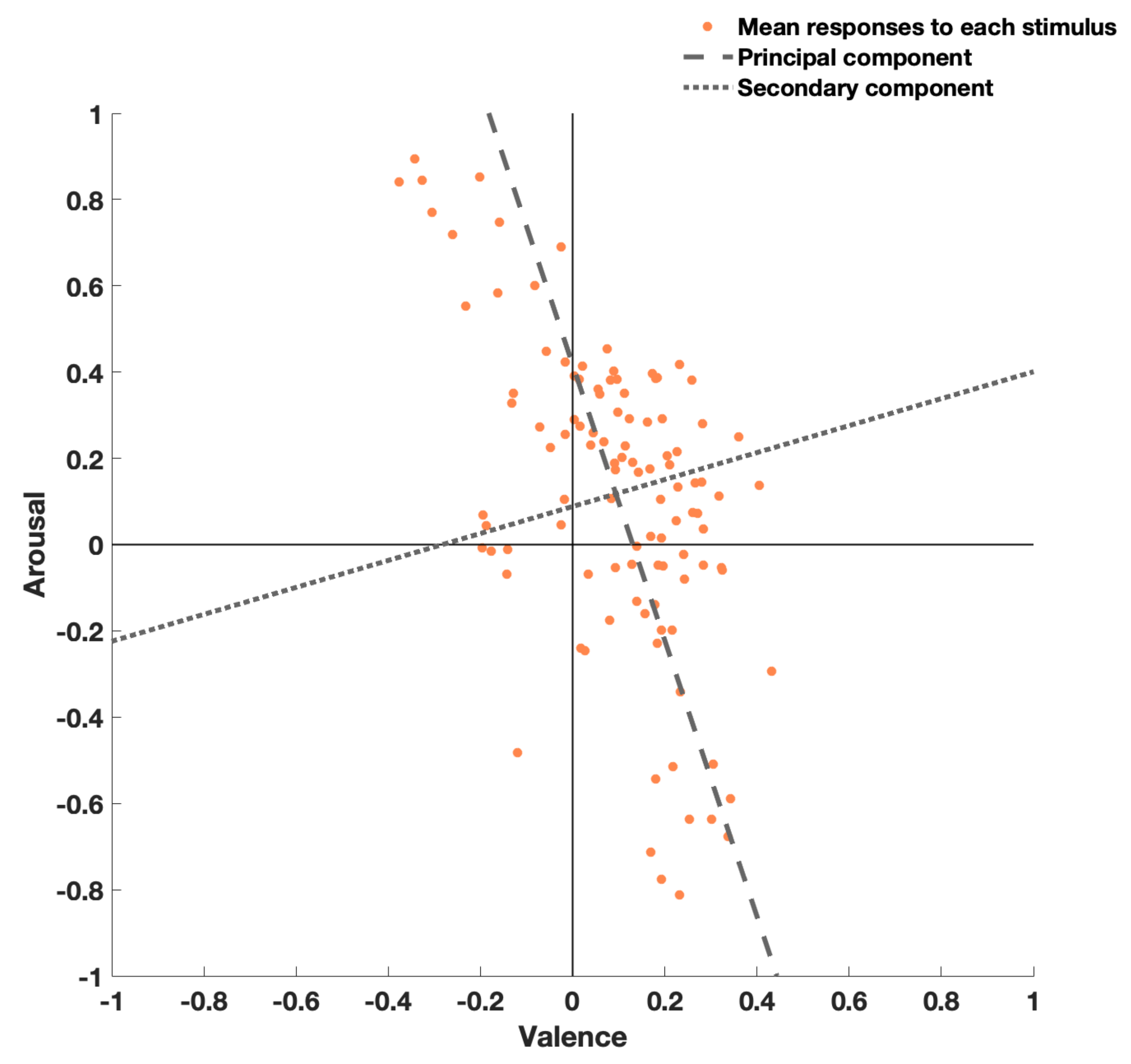 Mean responses of participants to each stimulus in Experiment 1, including principal and secondary components of principal component analysis.
