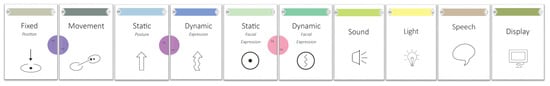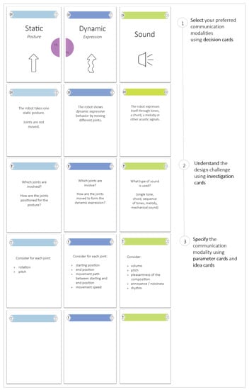 Studies show that cards are a suitable tool to conduct PD activities with older adults in the field of HRI [,]. Singh [] developed a card-based design kit that help users to describe and provide feedback on different aspects of voice-based agents. To this end, four types of cards a proposed: Actions cards that describe functionalities of the robot, personality cards that enable assessment of one’s own and the agent’s personality, theme cards that stimulate reflection on a high level (e.g., about the impact of the robot on your life), and design cards that guide the specification of different aspects of the robot and the interaction experience (form, materiality, inputs, outputs, location, connections via internet of things, personality and gender, ethics, and a final rating). The cards have been developed in the context of a number of user studies and demonstrated to be helpful for various age groups. Due to their initial focus on voice-based agents, they are not well suited to specify non-verbal behavioral expressions for social robots.