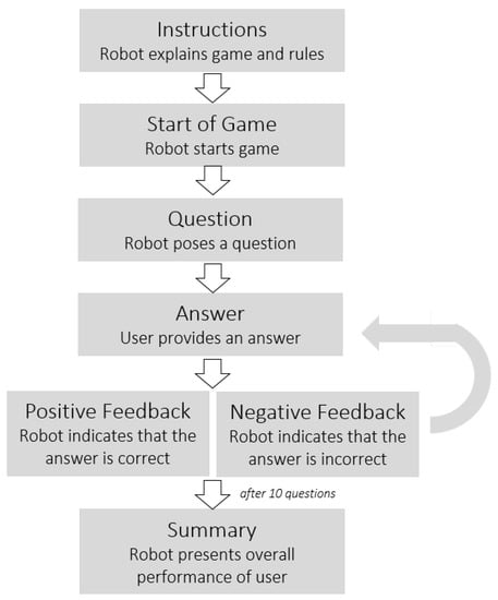 In the quiz game the robot acts as a quiz master who challenges the player with questions. Figure 3 summarizes the most important interaction steps in the course of the game. The player has to select the correct answer to the question out of three potential answers and receive feedback from the quiz master. The goal of the quiz game is to activate and entertain older adults by engaging them in brain training activities. In this set-up, the robot can take different roles to motivate the user to regularly play the game: It could, for example, take the role of a coach who persistently encourages the user in an empathic way. It could also act as an opponent that continuously pushes the user to a better performance by challenging their knowledge []. Which role the robot takes is expressed through its behavior and the different communication modalities. Part of the goal of the case study was to discover which roles the robot should take, in order to motivate the player of the quiz game. To this end, participants designed their own preferred behavior for the robot, which—implicitly—also yield information about the role participants would assign to the robot quizmaster. This role could potentially be a coach, opponent, or a completely different character.