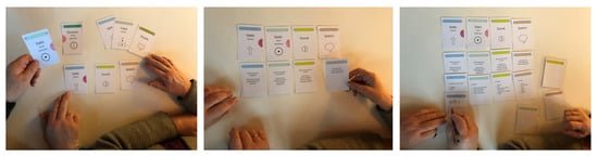 There are many tools and methods that can be used to support PD activities. Cards are a very common tool for design workshops to enrich design activities in a tangible and engaging way. They are often used in PD to actively engage users in the design process, as they make the design process visible [] and help to explain complex concepts to novices in a specific domain []. Due to their playful nature, working with cards appears to be less intimidating than the task of designing an interactive system []. At the same time, cards help to make ideas explicit and to develop theoretical ideas into concrete, practical design guidelines []. Thus, they can act as a communication tool between users and designers [].