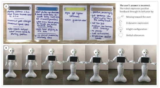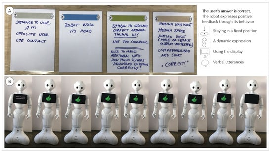 Example for a behavioral expression for the positive feedback situation: (A) Idea cards documenting the design solution. (B) Implementation on the Pepper robot.