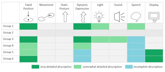 Figure 6 and Figure 7 provide examples for the behavioral expressions of the Pepper robot produced by the workshop participants for the positive and negative feedback situations. The workshop participants documented their specifications of the robot behavior using the idea cards (Figure 6A and Figure 7A). As the behavioral expressions were documented as text descriptions on a number of idea cards, no additional effort was required by the design team to interpret the results. If the descriptions were detailed and precise enough, they were implemented on the Pepper robot by a team of interaction designers after the workshops. Whether a description was detailed enough was determined by the design team during the implementation task. A description for a modality was labeled as “very detailed” if the design team could implement it on the Pepper robot without asking further questions. The label “somewhat detailed” was used when the description could be implemented by consulting the notes taken by the facilitator during the workshops. Descriptions were defined as “incomplete” if the design team lacked sufficient information for implementing the described ideas. Figure 8 and Figure 9 provide an overview of the assessment of the clarity of the descriptions produced by the workshop participants.
