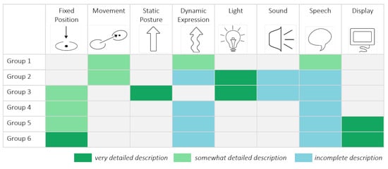 The workshop results show that the Modality Card Deck successfully guided the users to create behavioral expressions for the Pepper robot that combine different communication modalities. Following the different steps with the help of the different types of cards, they were able to make well-considered design decisions on which modalities to include (and which to leave aside). For the positive feedback situation, all five groups independently decided to let the robot show a “Dynamic Expression” in a “Fixed Position”, accompanied by speech. The described “Dynamic Expressions” reached from nodding over thumps up to extending both arms towards the user or in the air. Two groups also used the display to accompany the verbal feedback with pictures or color. The other groups included green lights in their design solutions and one of them also added sound. Figure 8 provides an overview of the modalities used for the positive feedback situation.