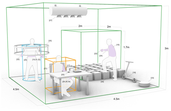 To envision a design space for Haptic VR in everyday confined spaces, we revisit the two criteria RE Scale and Haptic Display. As a design fiction [43], we illustrated all the 20 studies in the largest real environment size we had identified, i.e., 4.5 × 4.5 × 3 m [24] (see Figure 2). However, the following discussion will also include the other two relevant classifications, Haptics Type and Application Scenario, which both are related to the resulting motion and position of the VR user under physical constraints.