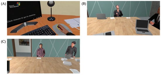 Screenshots depicting (A) scene 1, (B) scene 2, and (C) scene 3 in Study 2 (third-person perspective).