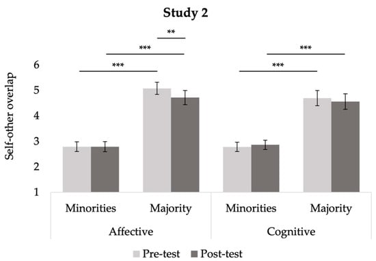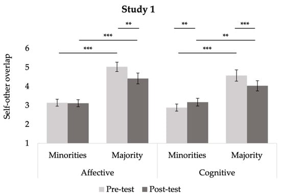 Plot depicting participants’ self-other overlap with minorities and majorities at pre-test and post-test within each condition in Study 1. * p < 0.05, ** p < 0.01, *** p < 0.001.
